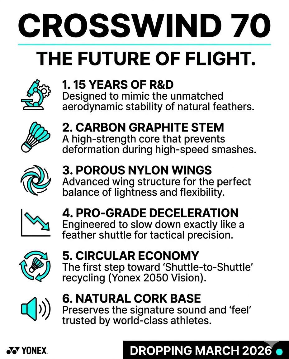 В света на бадминтона предстои тиха революция. След десетилетия, в които гъшите пера бяха единственият златен стандарт за професионална игра, Yonex официално хвърли ръкавицата с новия си модел – Crosswind 70.